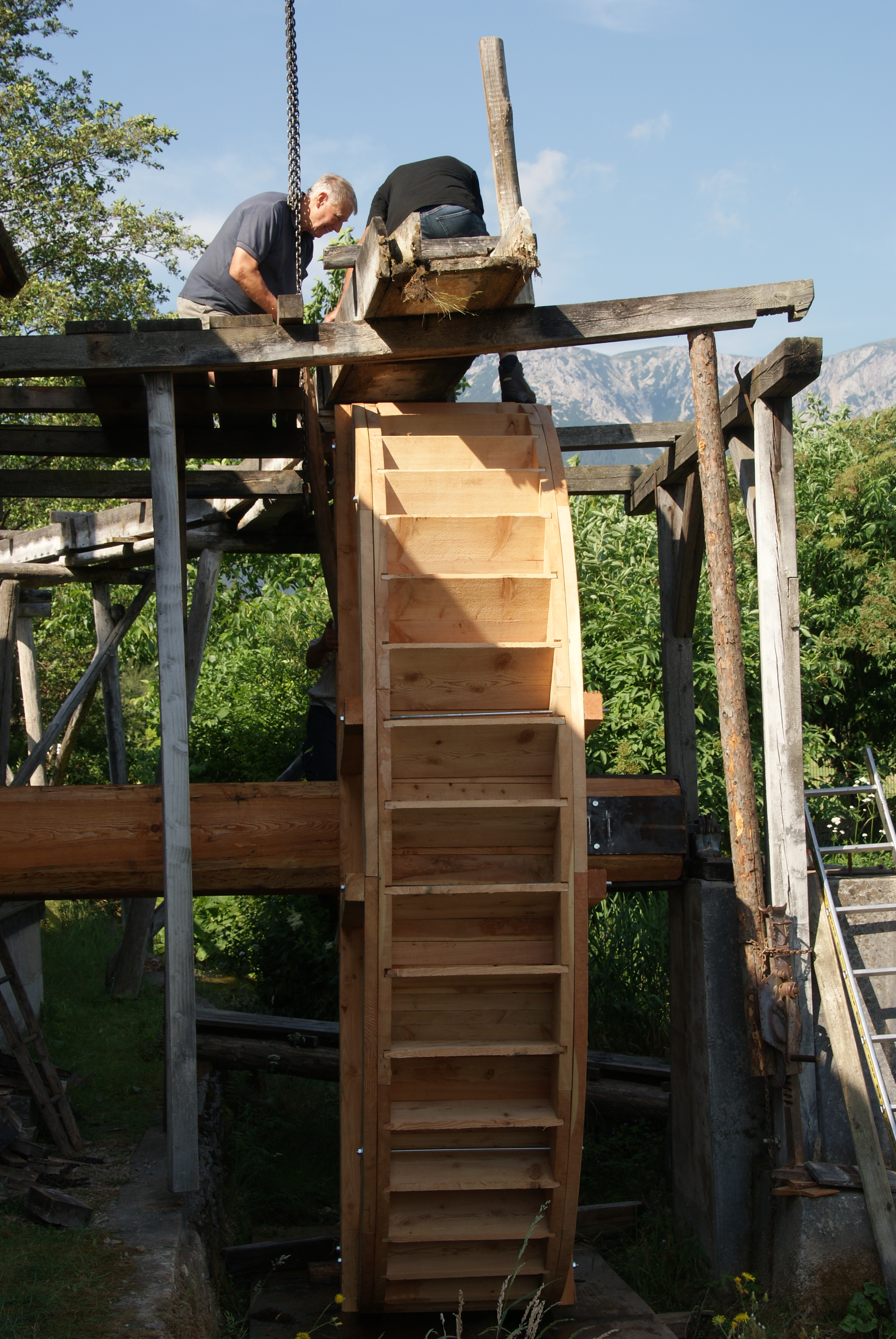Im Frühjahr 2022 wurde beschlossen, dass mit dem Bau eines neuen Wasserrades und des dazugehörigen Grindlbaumes begonnen wird. Das Wasserrad wurde von einem der wenigen Menschen die dieses noch können, im Sölktal, aus Lärchenholz hergestellt, in Einzelteile zerlegt und bei uns wieder zusammen gebaut. 2 Fotos